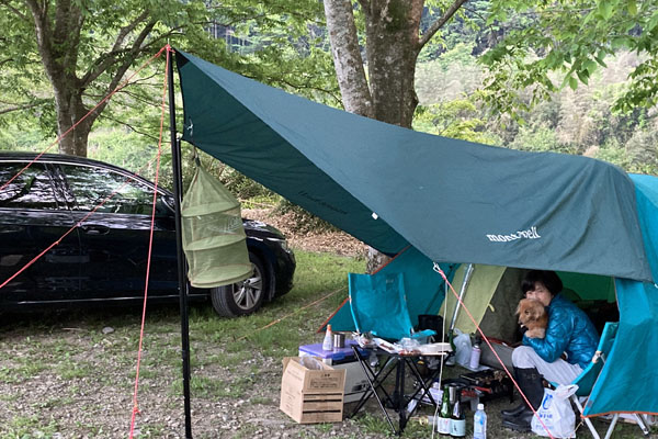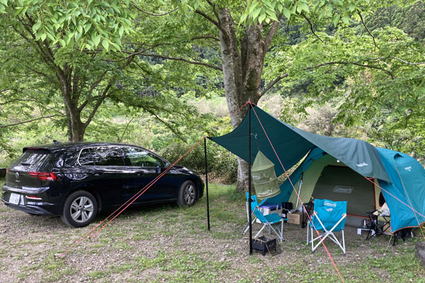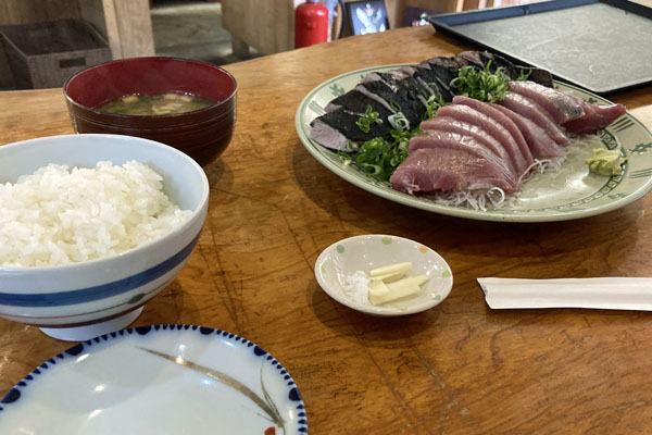 お昼に高知空港着。うそのように好天に。昼食にカツオの漬け丼\1,000-。妻が羽田から到着して合流。 すさきでたたき四人前持ち帰りで調達。いつもの天満宮前キャンプ場にテントを設営。たたきをいただく。