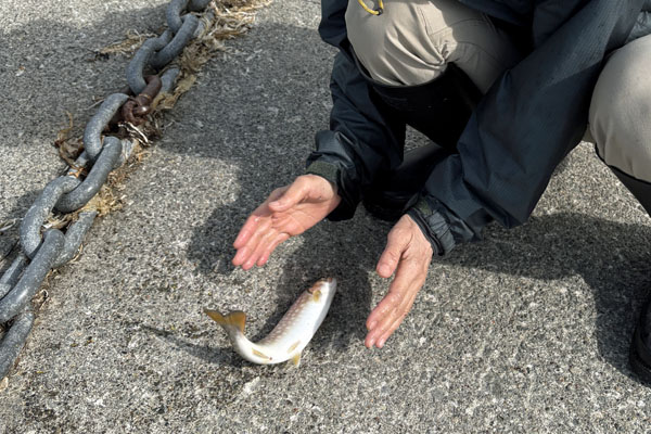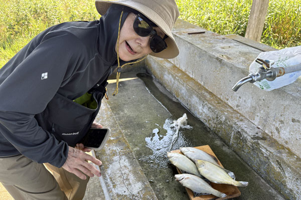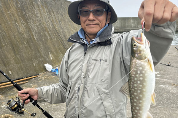 朝、釣りに参戦。妻がアメマスヒット。クルセイダー13g Gold。