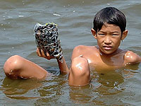 キャンプサイトの目の前の網走湖では、夏の間しじみ取りができることから、人気があるようだ。湖畔にあるおばちゃんに700円支払うと、専用のビニル袋がもらえて、この袋に一杯になるまでしじみを採ることができる仕組みになっている。しじみは、物凄く濃いので、いくらでも取れるが、大きいのが居るところと、小さいのが居るところがあるので、小さいのをあんまり採らないように注意するのがコツ。