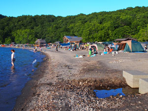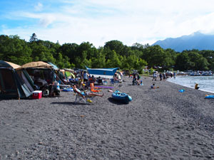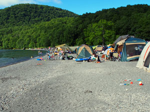 支笏湖の東南端のモーラップと呼ばれるあたりにある。支笏湖岸の砂浜にフリーテントサイトが広がっており、かなり広いが、客も多いのでハイシーズンは満員となるようだ。