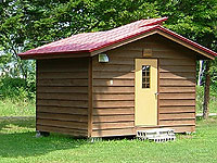 これで持ち込みテントは無料なのだから、文句なし。右の写真のバンガローも2400円と格安だ。でもよほどの悪天候で無い限り、芝生の上の方が気持ちよさそう。