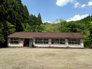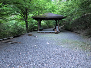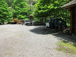 キャンプ場の施設は極めてシンプル。駐車場となる広いスペースのサイトには、トイレと東屋と小学校の廃校があるだけ。下に降りた日野地川沿いのテントサイトには炊事場が設置されている。