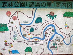 キャンプ場から、遊歩道を歩いて松葉川温泉まで行くことができる。 游歩道は森林公園 "游湯の里" となっていて、たっぷり森林浴できる。吊り橋を渡ってホテルのある所まで歩いて500mほど。この温泉、かなりいいです。お風呂も食事も。