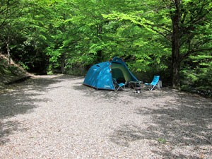 平坦な砂利 川沿いサイトはオートキャンプは不可。上の駐車場のようなサイトはオートキャンプ可能。 |