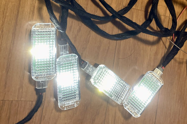 フットランプがないので、Golf5,6用という中華製ユニットをフロントとリアに設置。設置は問題なくぴったりと装着完了。車のシステム変更(コーディング)とフットランプ用の電源取り出しピンも情報を見つけられなかったので、アクセサリー電源から減光ユニット介して照度を調節しています。なので、昼間も点灯している状態。昼間はほとんど見えないので問題無しです。