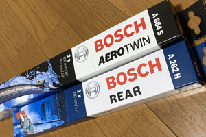 Golf7と同じで良いと思い込み、BOSCHのAERO TWIN A864S (\4,725)というフロント左右セットと、リヤ用にはA282H (\1,061)をネットで購入。価格はDラーで純正ワイパーを購入するより圧倒的に安い。フロントはワンタッチで簡単に交換できたが、リヤのアタッチメントがが適合しない。ゴムの長さも1inchほど純正より長いこと判明。少々悩んだが、ゴムだけ交換することでなんとか装着した。長さが合わないので1inchほどカット。