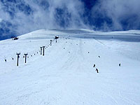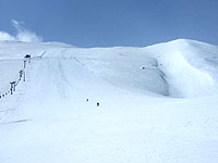 このあたりは、森林限界を越えているので、写真の通り木はない。雪の下はほとんどが笹になっている。相当に気持ちよく滑れるが、さえぎるものがないので、風が強いことが多く、寒いのは覚悟必要。