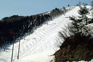 ■スキー場概要 福島市内からは45分、東北道飯坂ICからだったら30分位で行けるアクセスのいいスキー場。国道13号の栗子トンネルを出るとレインボーコース、グランプリコースが目の中に飛び込んできて、その日の混み具合が一目瞭然だったりする。私が超初心者の頃からお世話になっている昔ながらのスキー場で、規模は大きくないが初、中、上級それなりに楽しめるコースになっている。 ■それぞれが楽しめるそれなりのコース 上級者にはレインボーコース。向かって左、もろリフト下がコブ斜面になっていて上手にすべれば「わ〜すご〜い」と歓声がきこえ、コブに飛ばされようものならちょっと恥ずかしい思いをする。(そのぐらい近距離なのだ。)レインボウコースの右側は、圧雪されてフラットになっていることが多いので、高速パラレルなど様々なすべりを楽しむことができる。ここは一粒で二度おいしいコースなのだ。 高速ターンでスピード感を味わいたいならグランプリコース。横幅が広いので思い切りスピードが出せる。ここを仕切ってモーグルコースが出来たらしい。是非チャレンジしてください。(無料、って書かない方がいいのでは!?西日本のスキー場ならわかるけど・・・) ゆっくり山を楽しみたいならスカイラインコース。頂上から吾妻連山を見渡した後は、しっとりとした林間コースが楽しめる。(ここはシングルリフトなので子連れは要注意) ■ファミリー向けなんですが・・・ リフト料金は良心的だし、エコーコースは子供の練習コースにぴったりだったりするのだが、スキー場のベースから乗るリフトがロマンスリフト(上級者用、最大斜度33度)だったりするので子供がびびるかもしれません。リフトを降りて、もちろんレインボーコースには行かないが、エコーコースへ下る斜面もちょっと超初心者には厳しいかも知れない。しっかりボーゲンが出来るようであればまったく問題はありません。